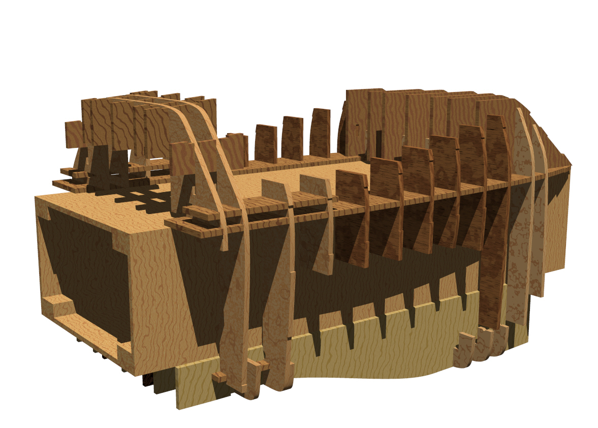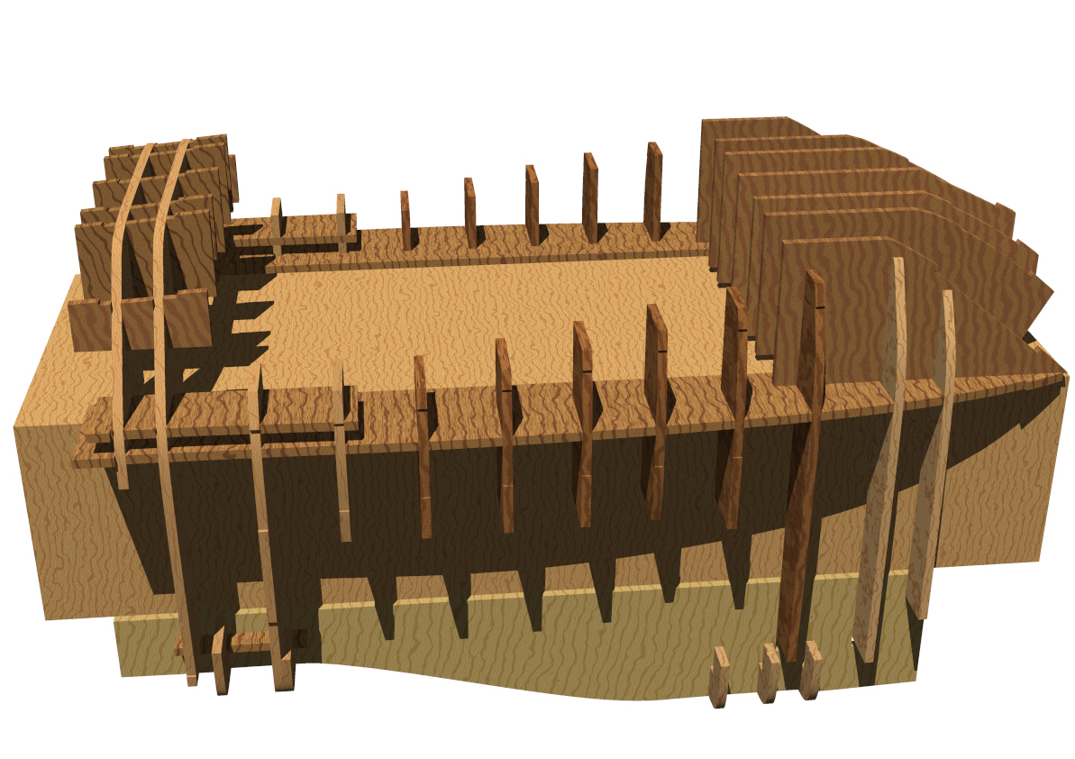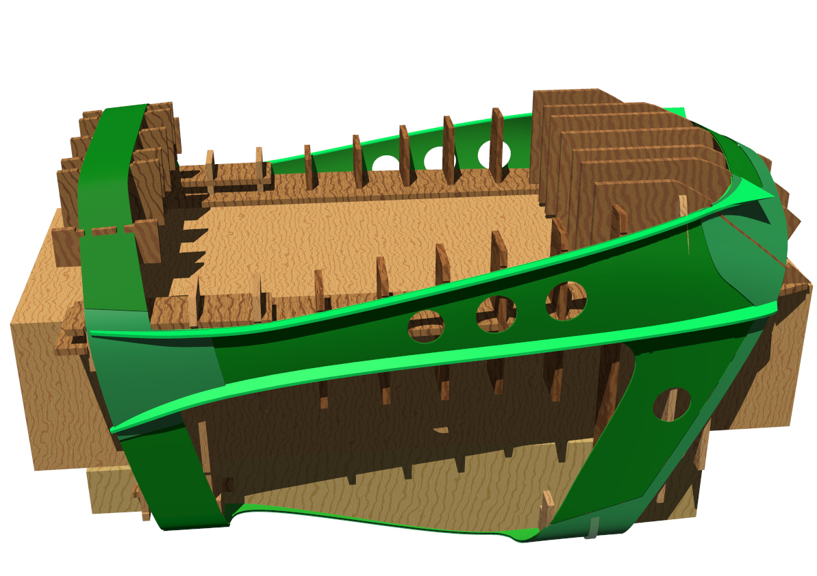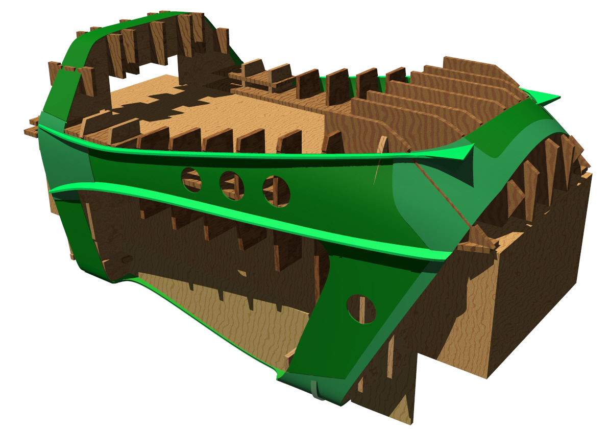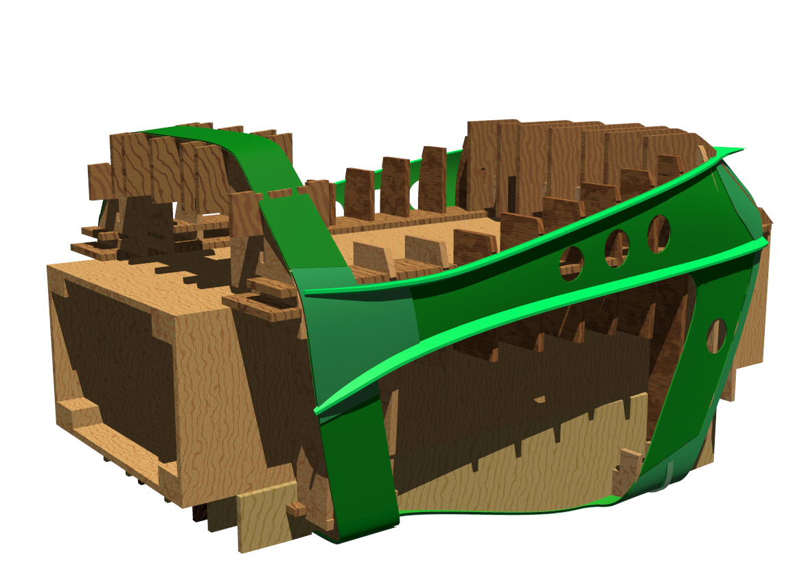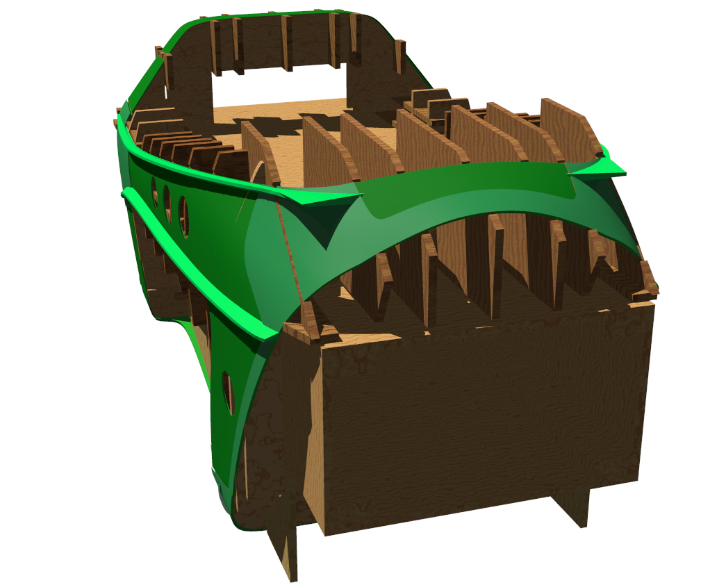 Kuvissa on ensin pelkkä jigi ja sitten miten itsekehikon laminointi (vihreät osat) sen päälle asemoituu. Jigi on viimeistelemätön, ts levyjen kulmia ei ole vinoissa kohdissa hiottu pois, sentakia jigin kulmat näkyvät laminaatinpäälle.